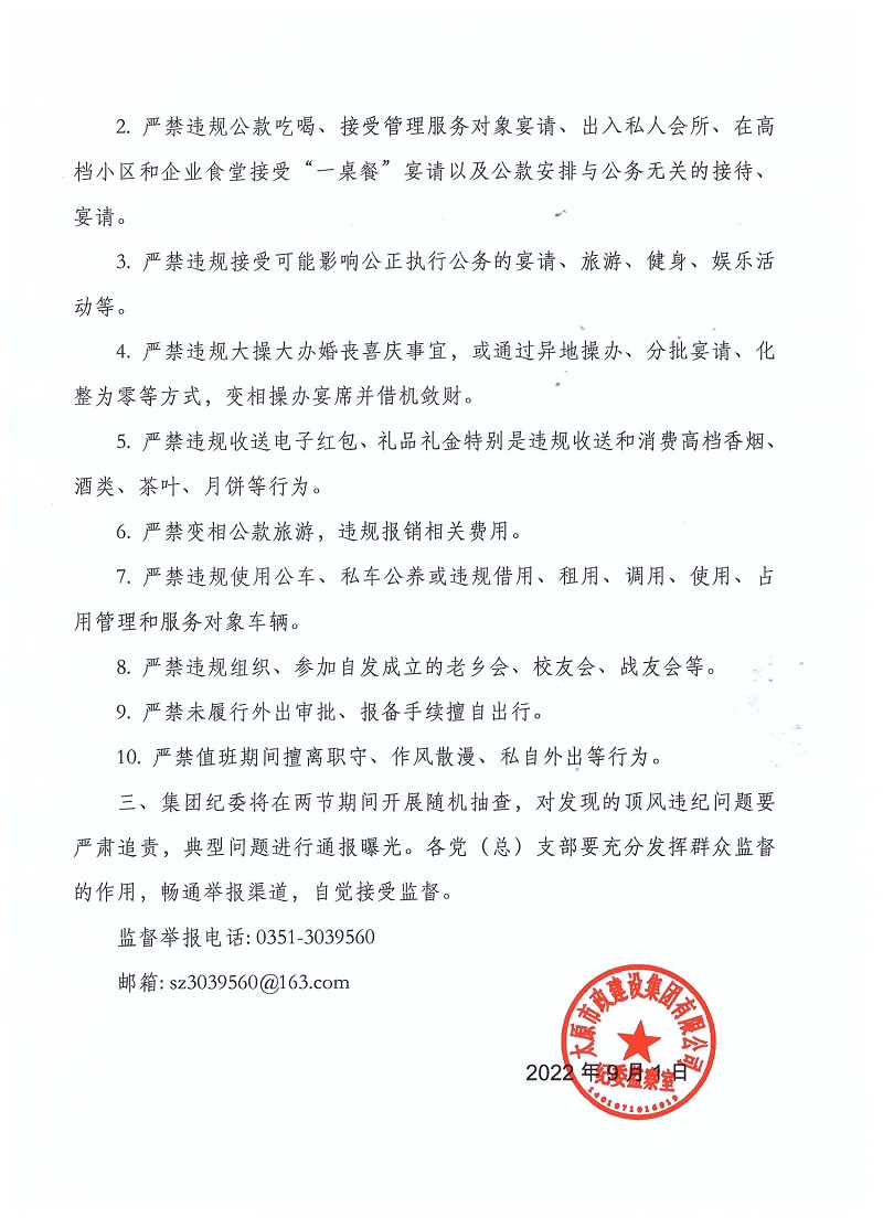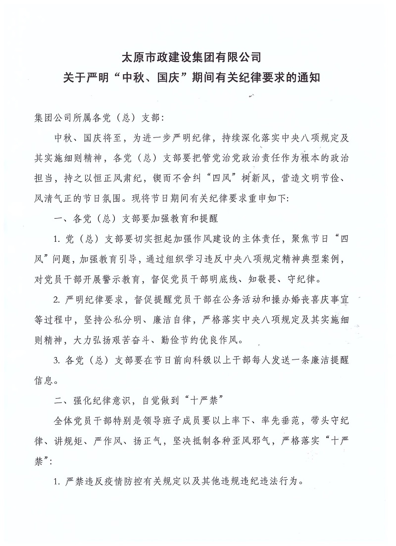 致太原市政建設(shè)集團(tuán)有限公司全體黨員的廉政倡議書及太原市政建設(shè)集團(tuán)有限公司關(guān)于嚴(yán)明“中秋、國慶”期間有關(guān)紀(jì)律要求的通知 發(fā)布時間:2022-09-01 09:23:57  來源:本站  閱讀:14820