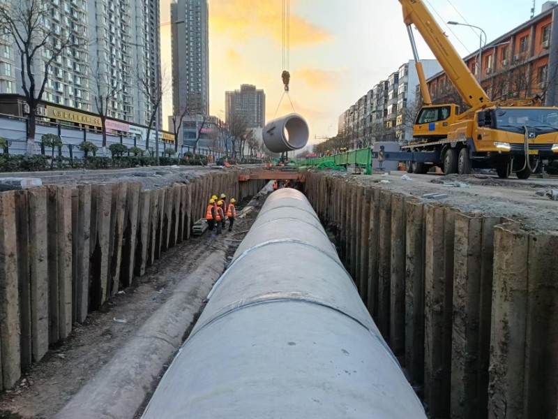 該工程位于勝利街,工程北澗河至解放路段道路全長1.74公里,規(guī)劃紅線寬度50米,污水管線主線長度為1919.5米,雨水管線主線長度為888.1米,雨污水管道施工采用明挖法與頂管施工相結合的方式。在新建管線區(qū)域,開挖深度超過5米,為確保施工安全,同時最大限度減少對周邊居民區(qū)的影響,基坑溝槽采用拉森鋼板樁進行支護。為保證鋼板樁施打位置準確無誤,施工人員在溝槽開挖后先進行場地平整,同時測量員進行定位,每隔兩米在中心線上插入鋼筋頭,以確保標記的準確性。打樁前,施工人員對鋼板樁進行逐個檢查。在插打過程中,實時進行監(jiān)測,保證每片鋼板樁的斜度不超過2%,樁體打入后,立即進行閉水性檢查,對漏水部位進行焊接修補,并安排專人每日對樁體進行檢查。項目部不斷提升施工安全管理水平,嚴格把控所有環(huán)節(jié),確保高標準高質量完成每一項工作。
