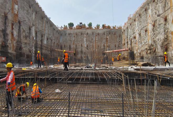 自工程開工以來,項目部合理規(guī)劃、統(tǒng)籌安排,先后完成了三軸水泥土攪拌樁、地下連續(xù)墻、抗拔樁、冠梁等一個又一個節(jié)點目標(biāo),高效推進工程建設(shè)。6月,為趕在汛期來臨前完成調(diào)蓄池和泵房底板混凝土澆筑的施工任務(wù),項目部做足前期保障工作,針對基坑內(nèi)作業(yè)面狹窄,土方、鋼筋、模板、混凝土澆筑等工程量大的情況。項目部緊密圍繞節(jié)點目標(biāo),從人員配置、材料供應(yīng)、安全措施、設(shè)備保障等方面進行全面規(guī)劃、統(tǒng)籌部署,保證各工序相互銜接、有序推進。同時,項目部采取對人、材、機進行動態(tài)調(diào)整的方法,24小時不間斷安排作業(yè),確保多個作業(yè)面同時施工,嚴(yán)格按日計算施工進度,全力推動工程進展。