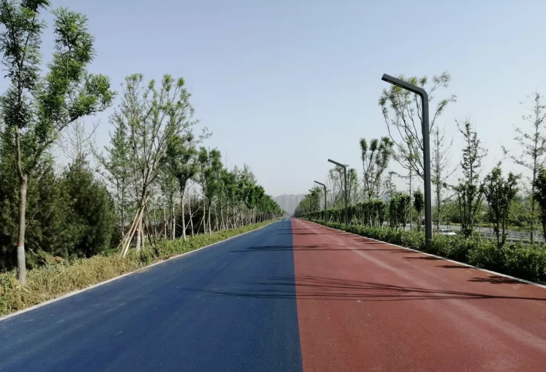 在道路鋪設(shè)過程中,為契合“二青”會體育精神,項(xiàng)目部在該工程面層鋪設(shè)彩色瀝青,不僅使路面更加干凈美觀,也為場館周邊道路增添一抹運(yùn)動色彩。由于東大堤頂涉及國際自行車賽道,項(xiàng)目部制定可行性方案,在1、2號出入口施工中,采用墻端倒圓角處理,確保交通安全順暢。工程建設(shè)中,項(xiàng)目部全體參建人員不忘初心,堅(jiān)守使命,以熱情燃燒“卡路里”,助力品質(zhì)工程建設(shè)。