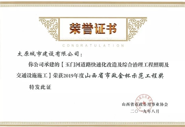 近日,太原城建公司玉門河道路快速化改造及綜合治理工程照明及交通設(shè)施工程榮獲山西省市政公用事業(yè)協(xié)會(huì)頒發(fā)的2019年度“山西省市政金杯示范工程獎(jiǎng)”。太原城建公司靳耕榮獲2019年度“山西市政工程優(yōu)秀項(xiàng)目經(jīng)理”榮譽(yù)稱號(hào)。